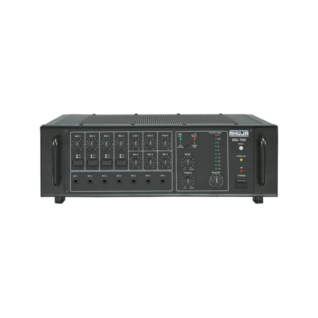 Introducing the AHUJA SSA-7000 PA Mixer Amplifier, a formidable audio solution meticulously engineered to meet the demands of professional sound reinforcement applications. With its robust design, advanced features, and impressive power output, the SSA-7000 embodies AHUJA’s commitment to excellence in audio performance.