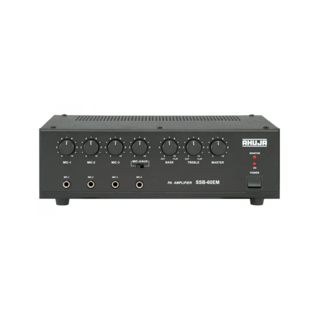 Introducing the AHUJA SSB-60EM Mixer Amplifier, a versatile and compact audio solution meticulously engineered to meet the diverse needs of sound reinforcement applications. With its reliable performance, intuitive controls, and robust construction, the SSB-60EM is an ideal choice for small to mediumsized venues such as schools, offices, houses of worship, and conference rooms.