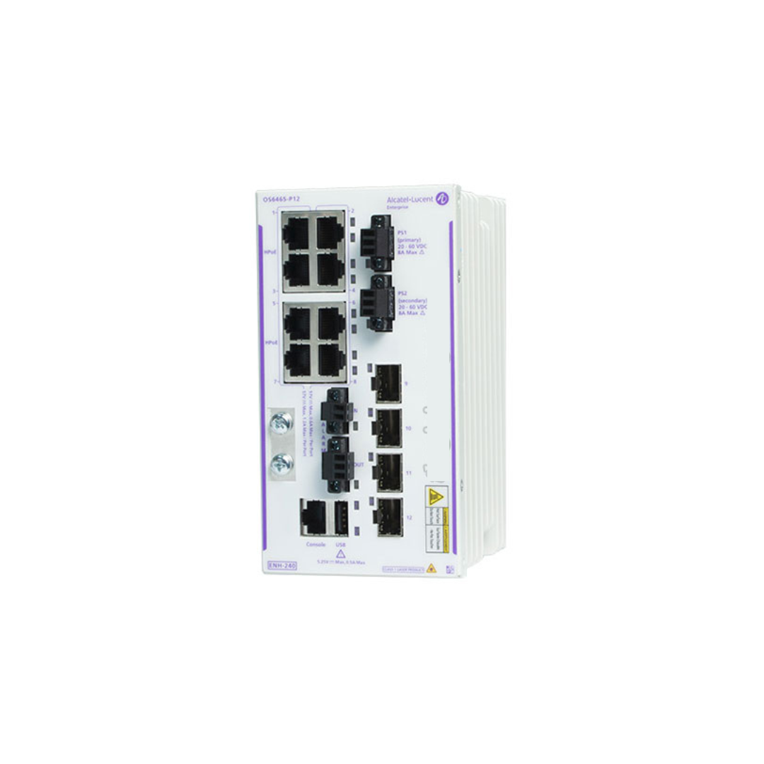 The OmniSwitch OS6465H-P12 is a rugged, industrial-grade Ethernet switch designed by Alcatel-Lucent for outdoor and harsh environmental conditions. Equipped with 12 Gigabit ports, including PoE+ support on 8 ports, this hardened switch is tailored for industrial IoT (IIoT), smart cities, transportation systems, and factory automation.