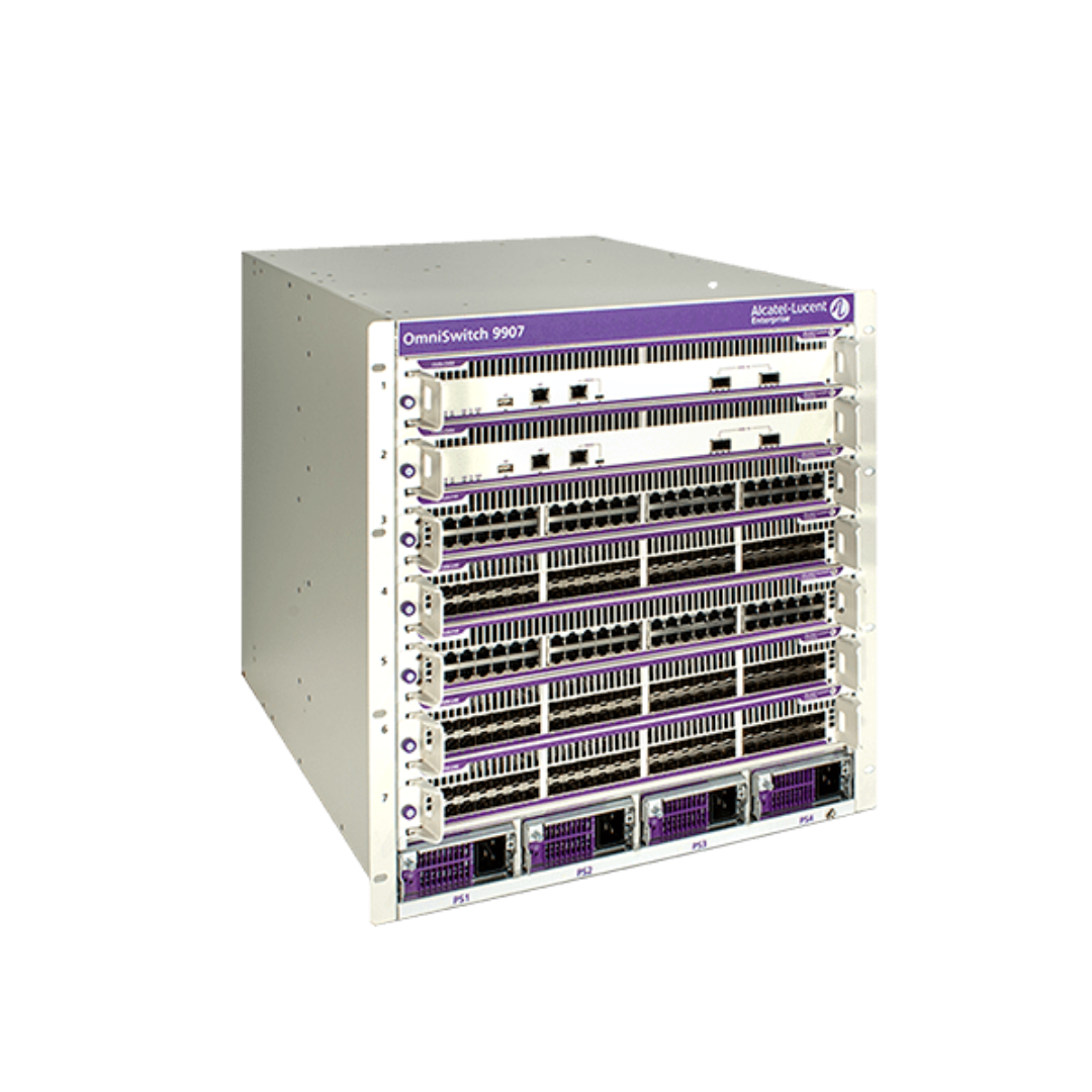 The OmniSwitch OS9907 is a modular 7-slot chassis switch from Alcatel-Lucent designed for the core and aggregation layers of high-performance enterprise networks. Ideal for data centers, large campuses, and carrier-grade environments, the OS9907 offers high-density switching, wire-speed Layer 2/3 routing, and modular scalability to meet growing bandwidth needs.