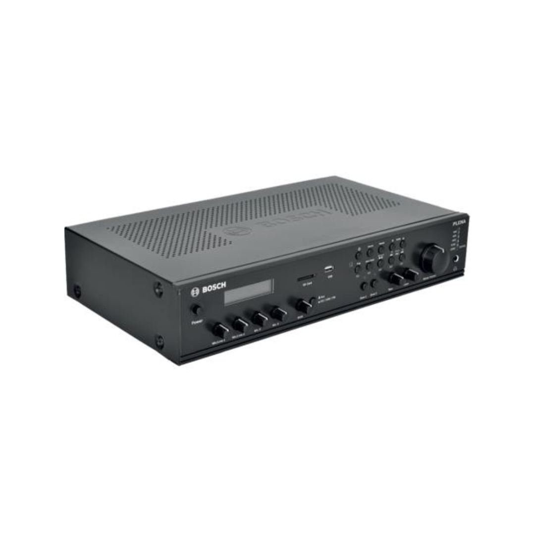 The Bosch PLN-2AIO180-IN is a high-performance all-in-one amplifier with 180W power output and 2-zone configuration, ideal for commercial and public address applications. It supports 4 microphone inputs, each with independent level control, allowing seamless multi-source audio management. The integrated USB and SD card slots enable MP3 playback, while the built-in FM tuner with preset memories offers added convenience.