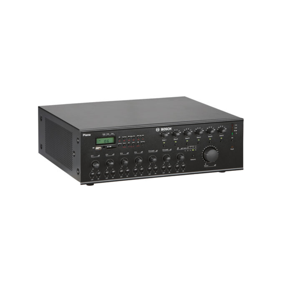 The Bosch PLN-6AIO240 is a professional-grade, all-in-one amplifier designed for businesses, conference halls, hotels, and retail spaces. With 240W of power and a 6-zone paging system, it delivers clear, high-quality sound for both background music and public address needs.