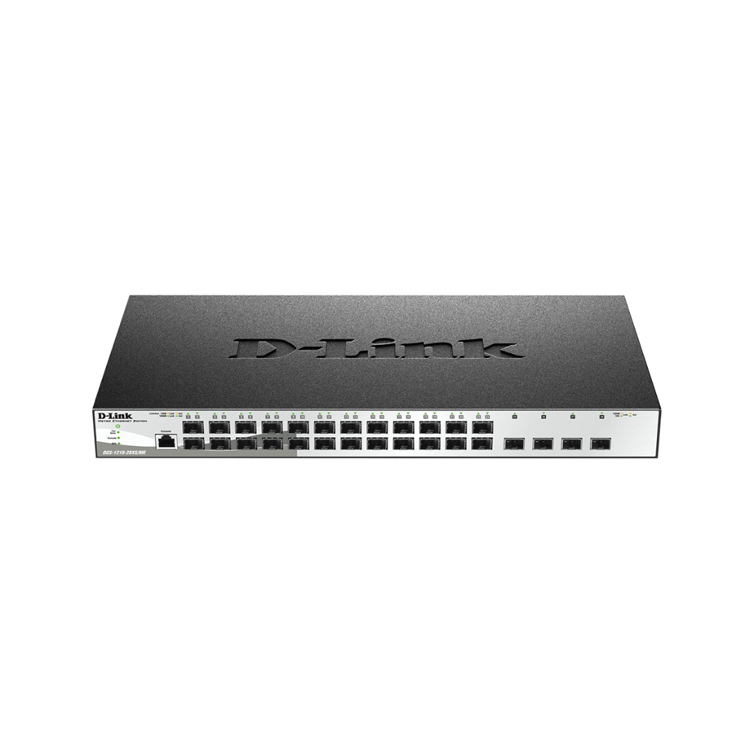 The D-Link DGS-1210-28XS/ME is a 28-port Gigabit Fiber Metro Ethernet Switch tailored for high-performance networking in enterprise and metro Ethernet environments. Equipped with 24 Gigabit Ethernet ports and 4 SFP fiber ports, it offers exceptional flexibility and scalability. This switch is ideal for expanding networks, offering enhanced security features like 802.1X authentication and VLAN support, ensuring a secure and efficient network. The DGS-1210-28XS/ME supports energy-saving technologies such as IEEE 802.3az, reducing power consumption without compromising on performance. Its Layer 2 features provide high availability and network redundancy, making it perfect for businesses requiring reliable, high-speed connections. With robust QoS (Quality of Service) support, you can prioritize critical applications, ensuring smooth and uninterrupted data flow.