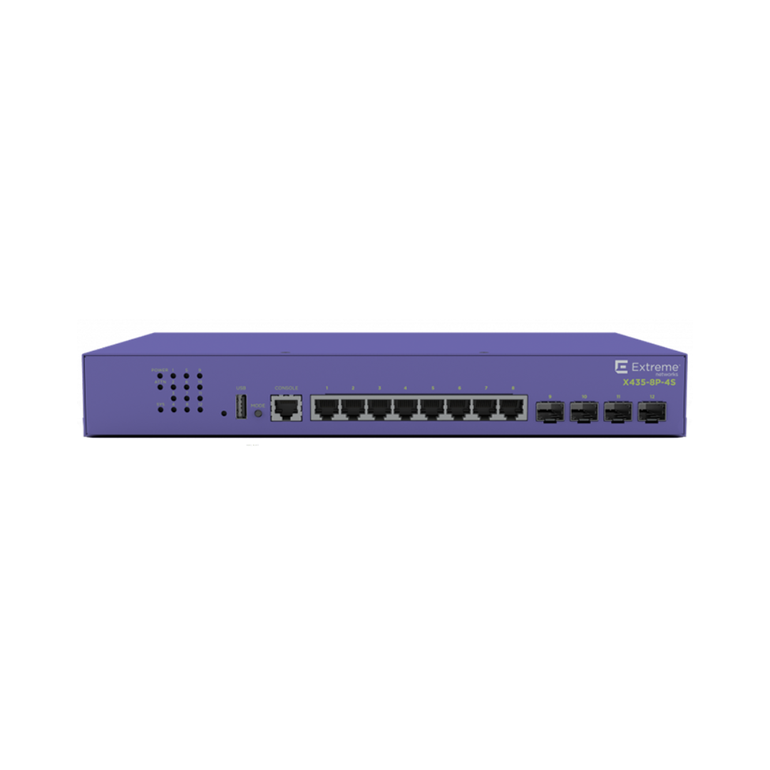 Administrators can manage the device via ExtremeCloud IQ or on-premises tools for flexible network control. Perfect for enterprise edge, small branch offices, and smart building applications, the X435-8P-4S combines power, performance, and security in a compact footprint.