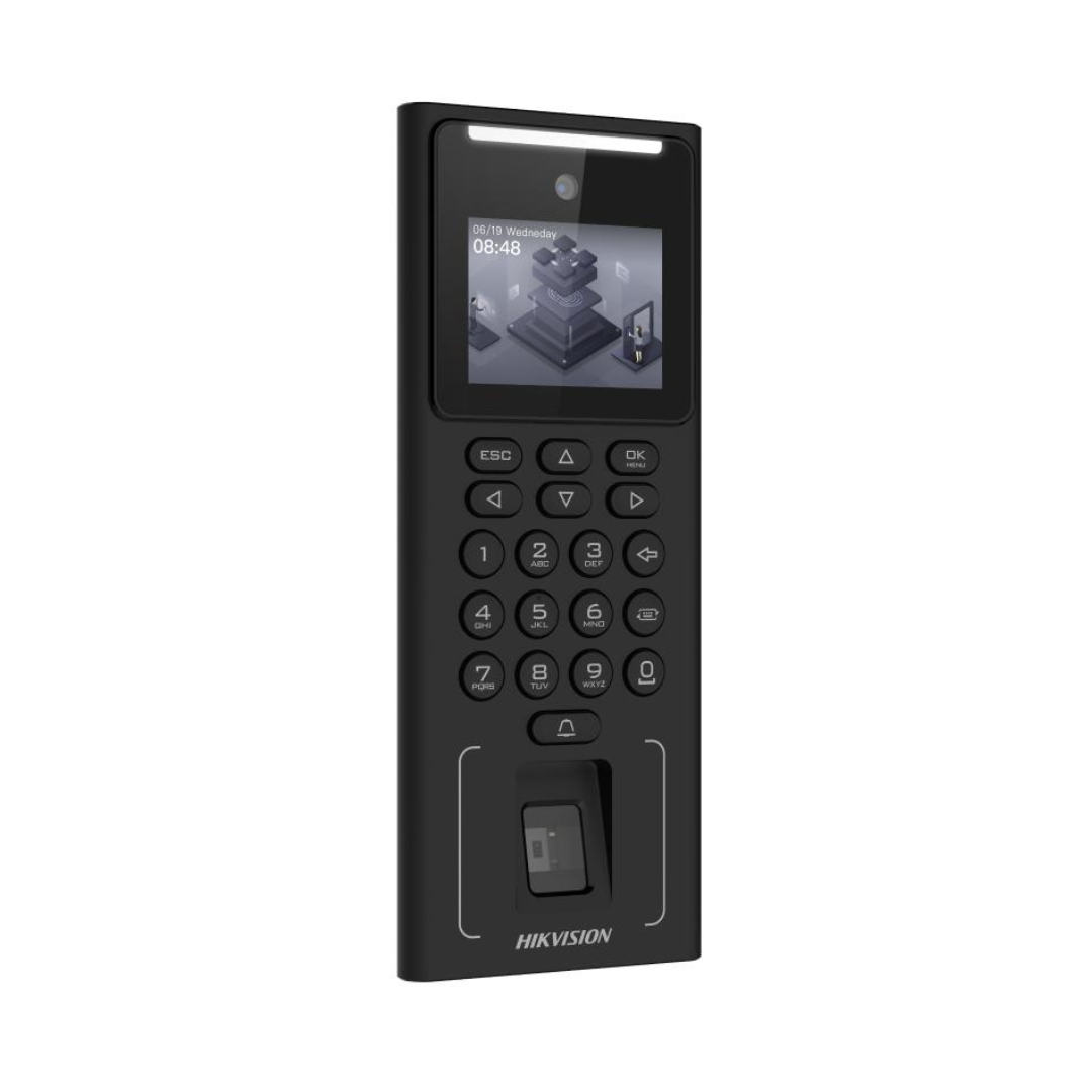 | The DS‑K1T321 Series enhances access control with a fingerprint reader plus face, card, and PIN recognition. Housing a 2 MP camera on a 2.4LCD, it supports encrypted storage of 500 faces, 3,000 cards, and 3,000 fingerprints. Recognition time is ~0.2 s with deep-learning anti-spoofing .