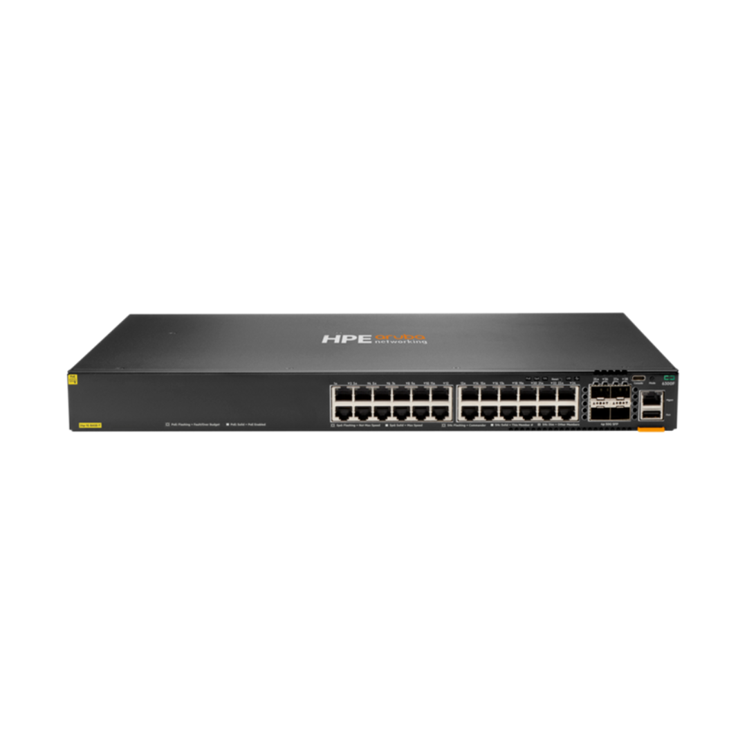 HPE Aruba CX 6300F 24p 10M/100M/1G 4p SFP56 50G TAA switch delivers high-performance Layer 2/3 connectivity with 24 ports supporting Class4 PoE+ for powering Wi-Fi APs, IP phones, cameras, and IoT devices. Four SFP56 50G uplinks provide fast backbone connectivity.