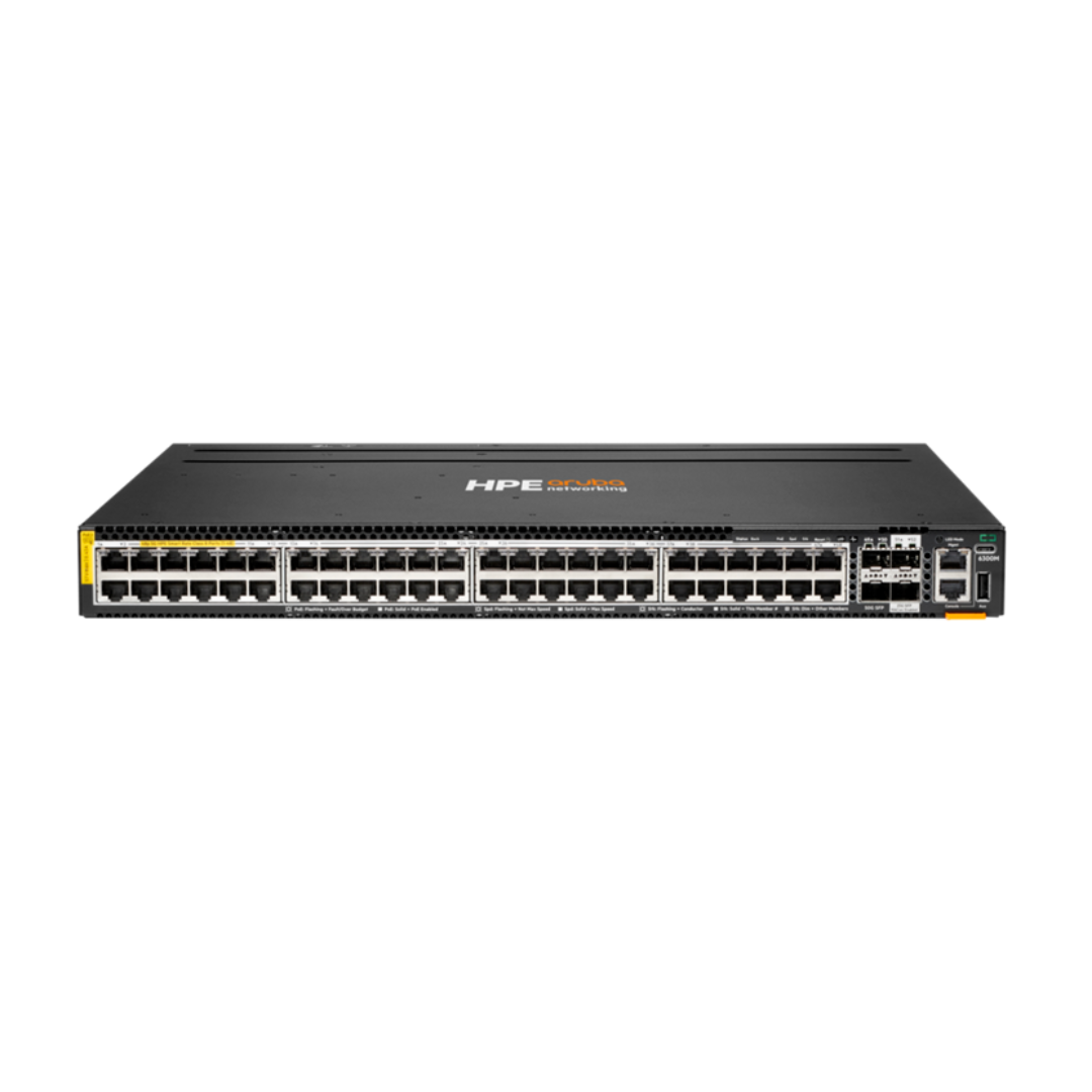 HPE Aruba CX 6300M 48p Smart Rate Class6 PoE switch provides high-performance enterprise connectivity with multi-gig Smart Rate ports supporting 1G/2.5G/5G. Class6 PoE ensures up to 60W per port for high-powered APs, IP phones, and cameras. Four SFP56 50G uplinks provide high-speed backbone connections.
