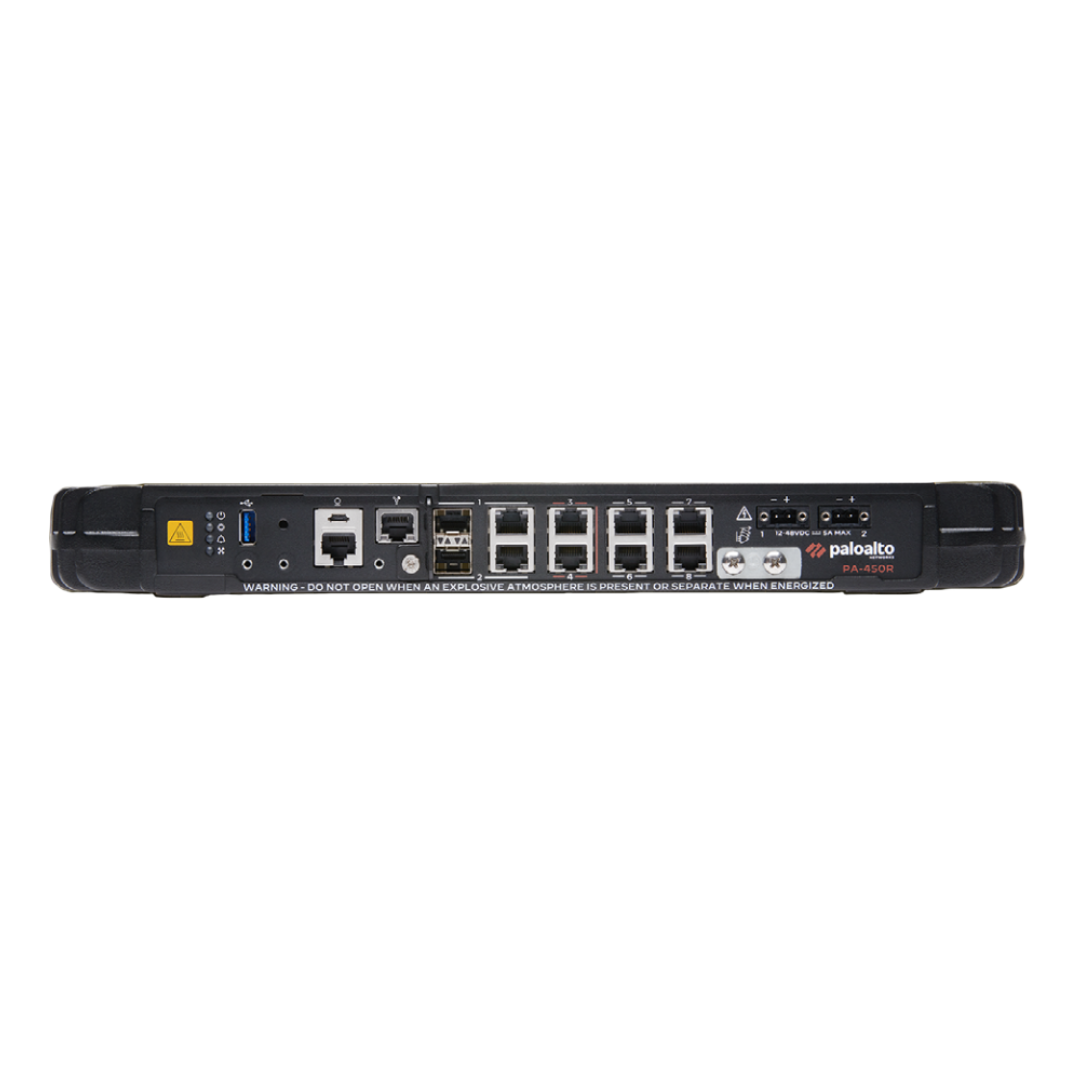 The Palo Alto Networks PA-450R is a high-performance, rugged firewall appliance designed for industrial, commercial, and government applications that require reliable security in harsh environments. Built to handle extreme temperatures and high humidity, it is the ideal choice for deployments where other firewalls might fail. The PA-450R upgrades the PA-220R with more robust hardware, offering enhanced security capabilities.