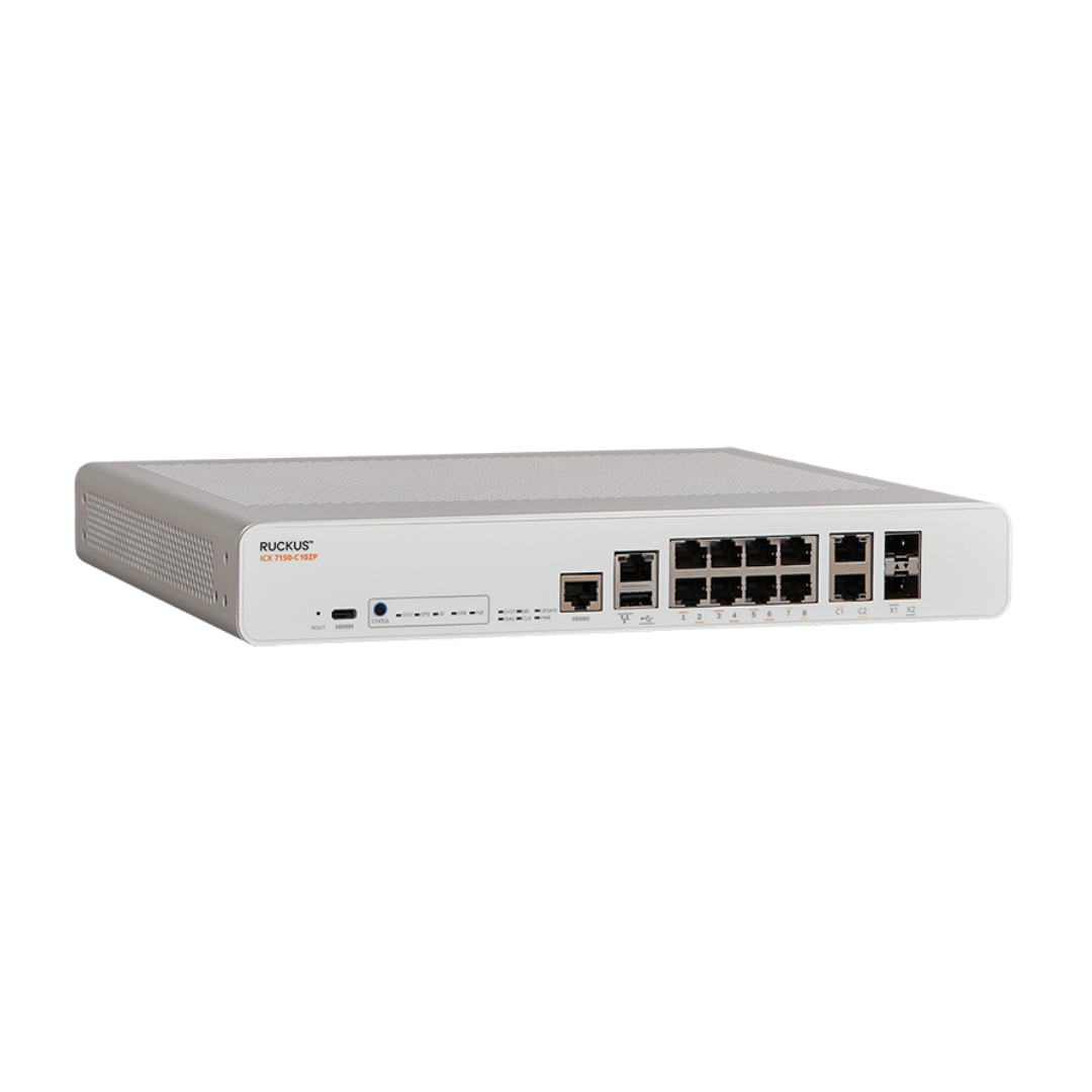 The Ruckus ICX 7150-C10ZP is an entry-level access compact switch with 10 ports and multigigabit speeds, designed for modern network environments. It supports Power over Ethernet (PoE) to power devices like access points and surveillance cameras, making it ideal for small to medium-sized businesses. This switch provides scalability, advanced security, and cost-effective performance for growing networks.