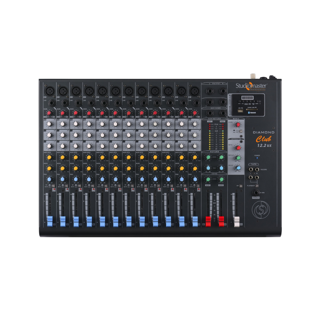 The Studiomaster Diamond Club 12.2UX is a cutting-edge 12-channel mixer that brings professional-grade sound control to any live performance or studio session. Part of the trusted Diamond Club series, this mixer is designed for both ease of use and exceptional audio output. It features onboard delay EFX, allowing for dynamic sound effects that enhance every performance. With Bluetooth connectivity, users can stream music wirelessly, providing more flexibility during live events or studio recordings.