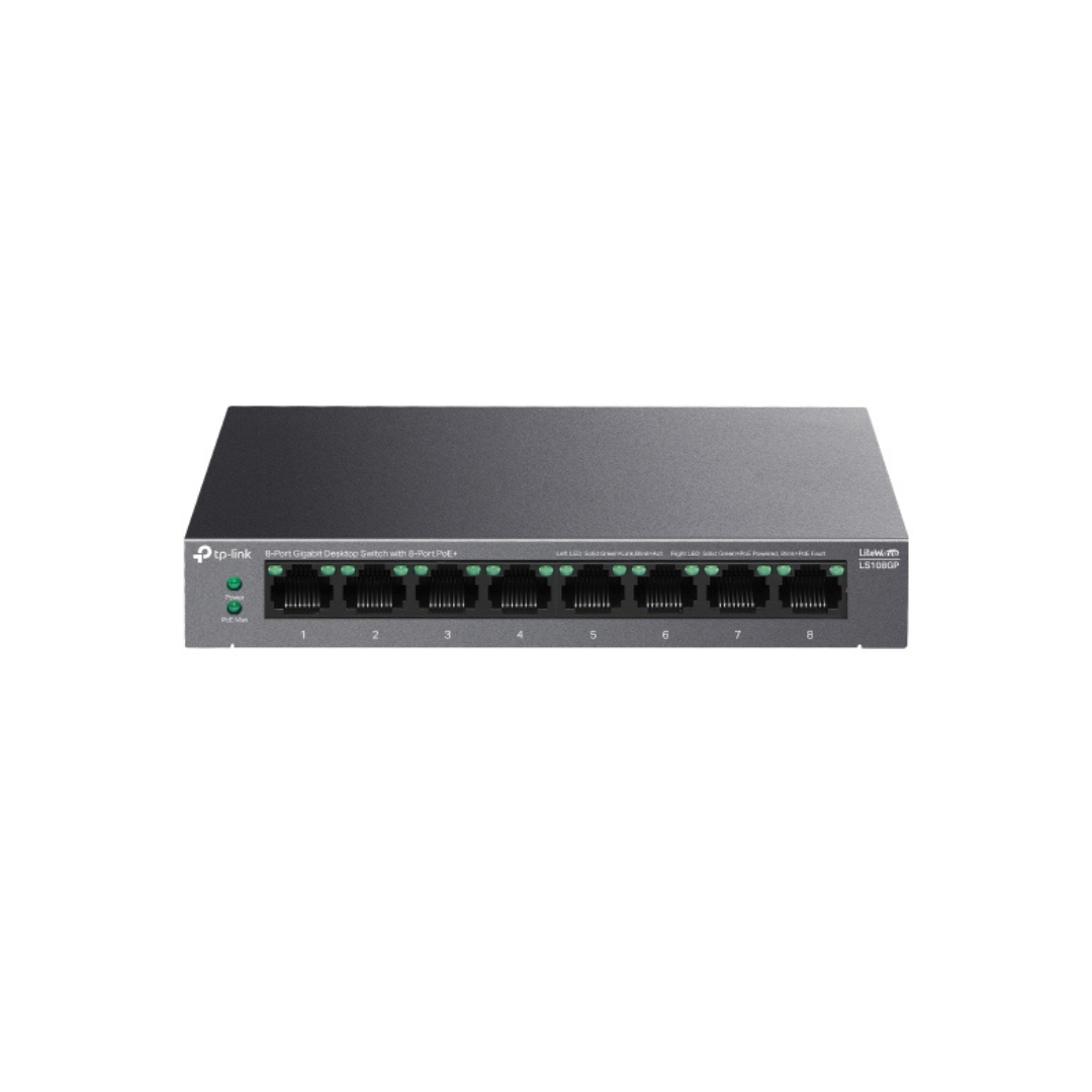 The TP-Link LS108GP 8-Port Gigabit Desktop Switch offers efficient and reliable network expansion, featuring 8 high-speed Gigabit PoE+ ports that support 802.3af/at standards. With 62W PoE power, this switch is perfect for powering devices such as IP cameras, VoIP phones, and wireless access points directly through the Ethernet cable. Its compact, sturdy steel case makes it ideal for desktop or small office environments.